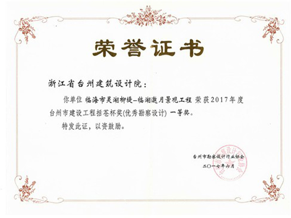 臨海市靈湖柳堤-靈湖邀月景觀工程獲2017括蒼杯獎(jiǎng)(優(yōu)秀勘察設(shè)計(jì))一等獎(jiǎng)