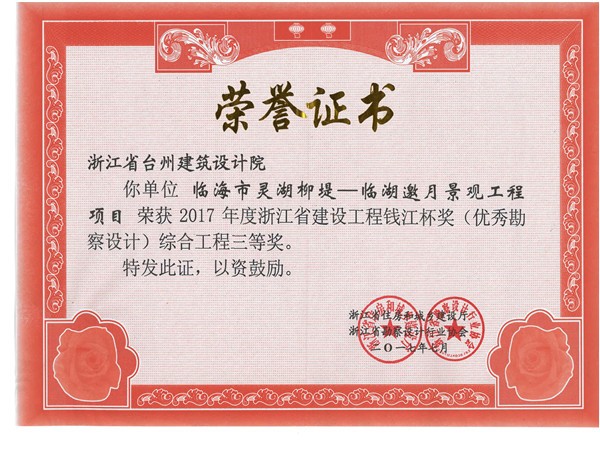 靈湖柳堤-臨湖邀月景觀工程項(xiàng)目獲浙江省建設(shè)工程錢江杯獎(jiǎng)(優(yōu)秀勘察設(shè)計(jì))綜合工程三等獎(jiǎng)