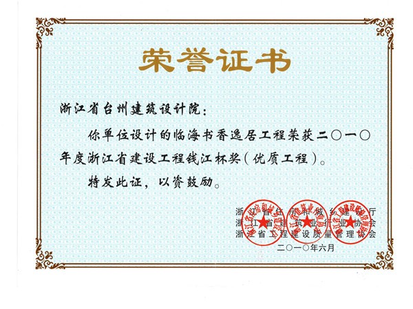 書香逸居工程獲2010浙江省建設(shè)工程錢江杯獎(jiǎng)(優(yōu)質(zhì)工程)