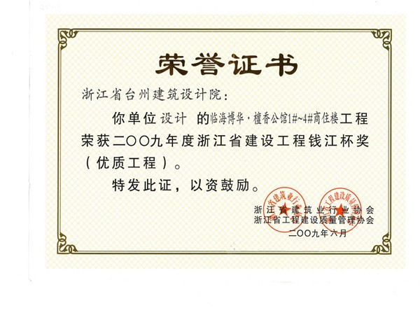 檀香公館1#~4#商住樓工程獲2009浙江省建設(shè)工程錢江杯獎(jiǎng)(優(yōu)質(zhì)工程)