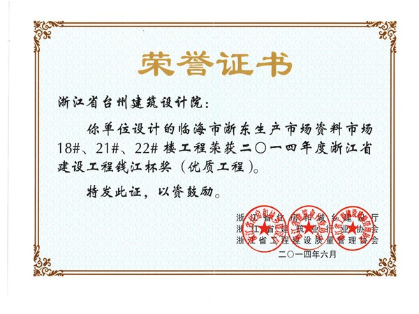浙東生產(chǎn)市場(chǎng)資料市場(chǎng)18#、21#、22#樓工程獲2014浙江省建設(shè)工程錢江杯獎(jiǎng)(優(yōu)質(zhì)工程)